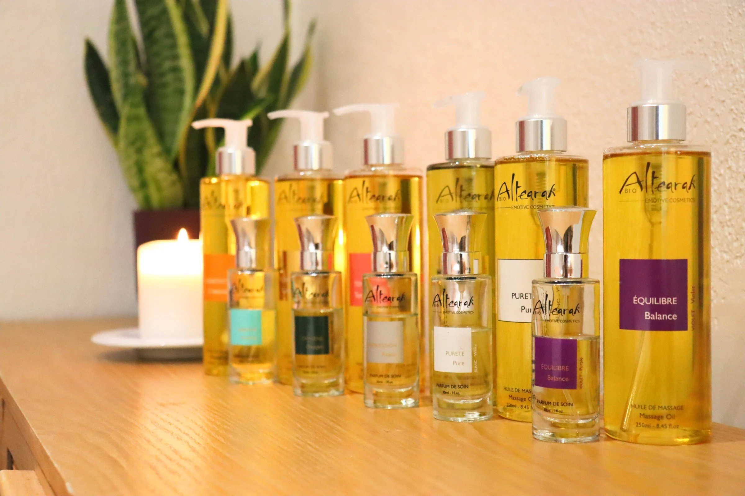 huiles de massage althéarah bio aux huiles végétales et essentielles, émotives cosmétiques posées sur une table de massage à l'espace Solae, cabinet de soins holistiques à Nîmes par Andréa Sibel